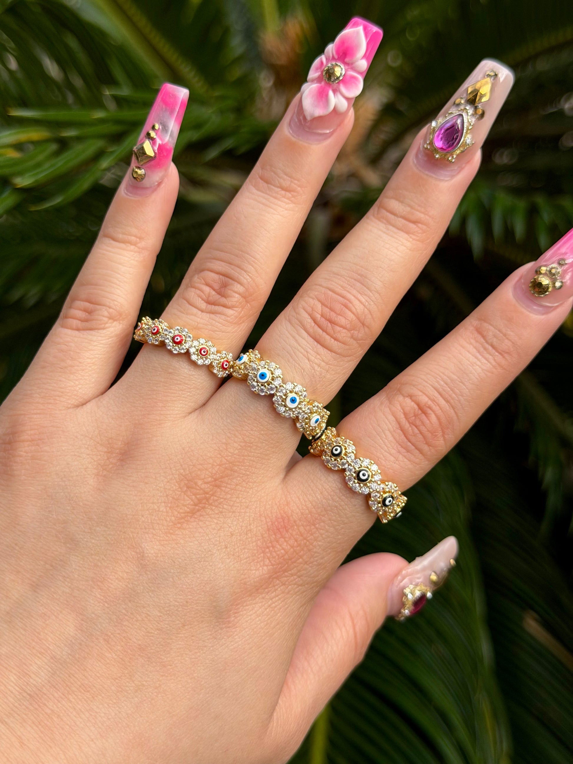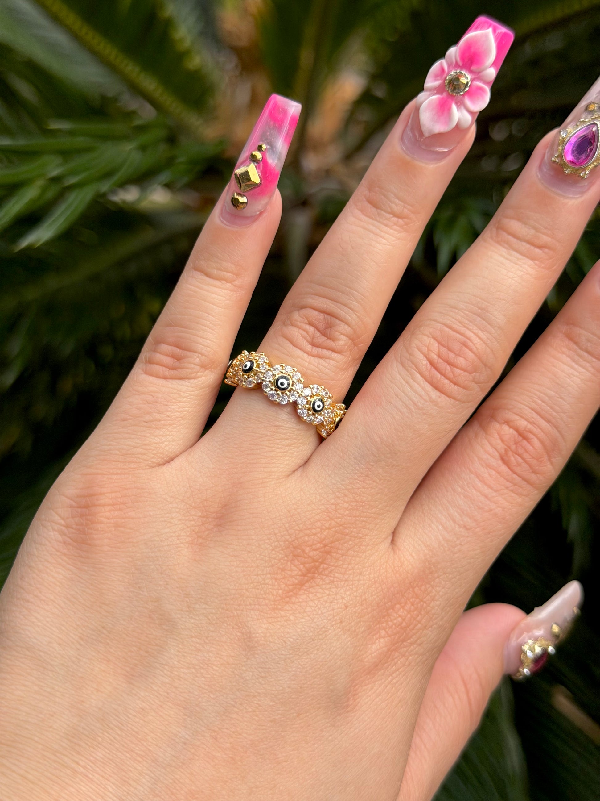 Un anillo vibrante y lleno de significado. Su diseño combina pequeñas flores tipo margarita en acabado dorado, cada una adornada con un ojo protector en diferentes colores —rojo, azul y negro— simbolizando energía positiva, buena suerte y protección contra las malas vibras.
