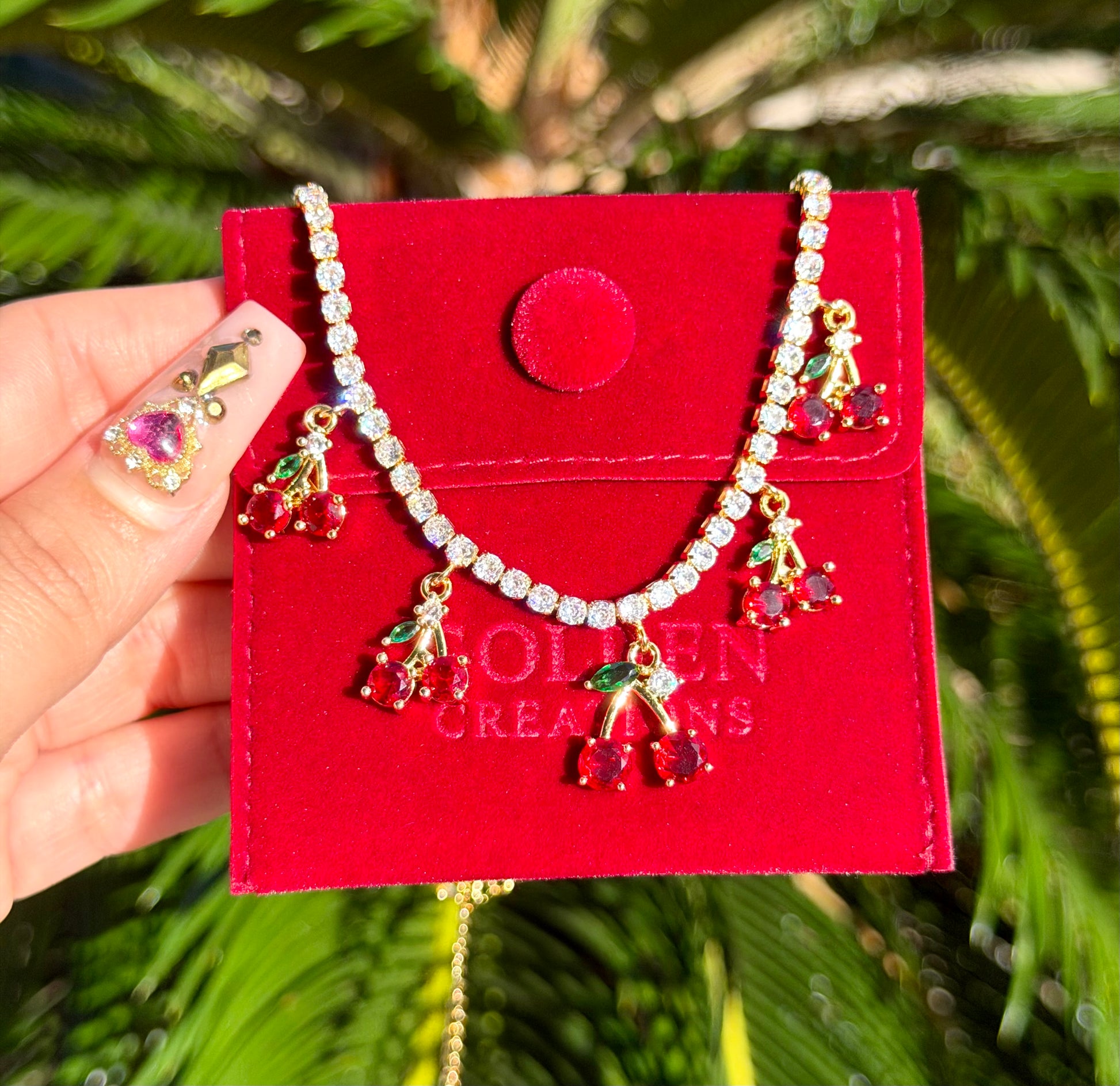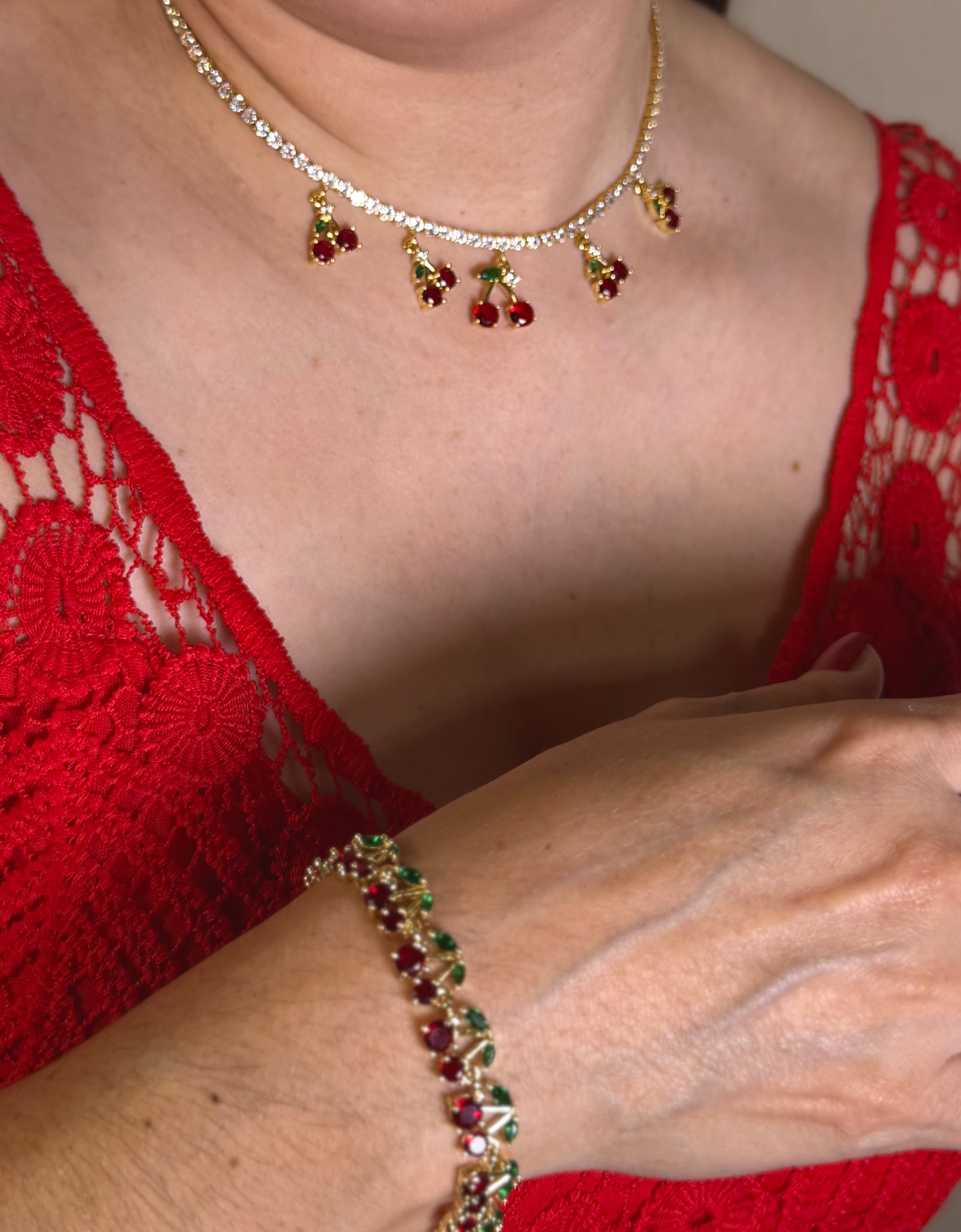 Un collar encantador que combina el brillo clásico de un tennis necklace con la dulzura juguetona de charms de cerecitas rojas. La cadena está elaborada con cristales blancos de alta luminosidad que aportan un brillo espectacular, mientras que los colgantes de cereza —detallados con hojas verdes y cristales rojos— añaden un toque fresco, coqueto y súper femenino.